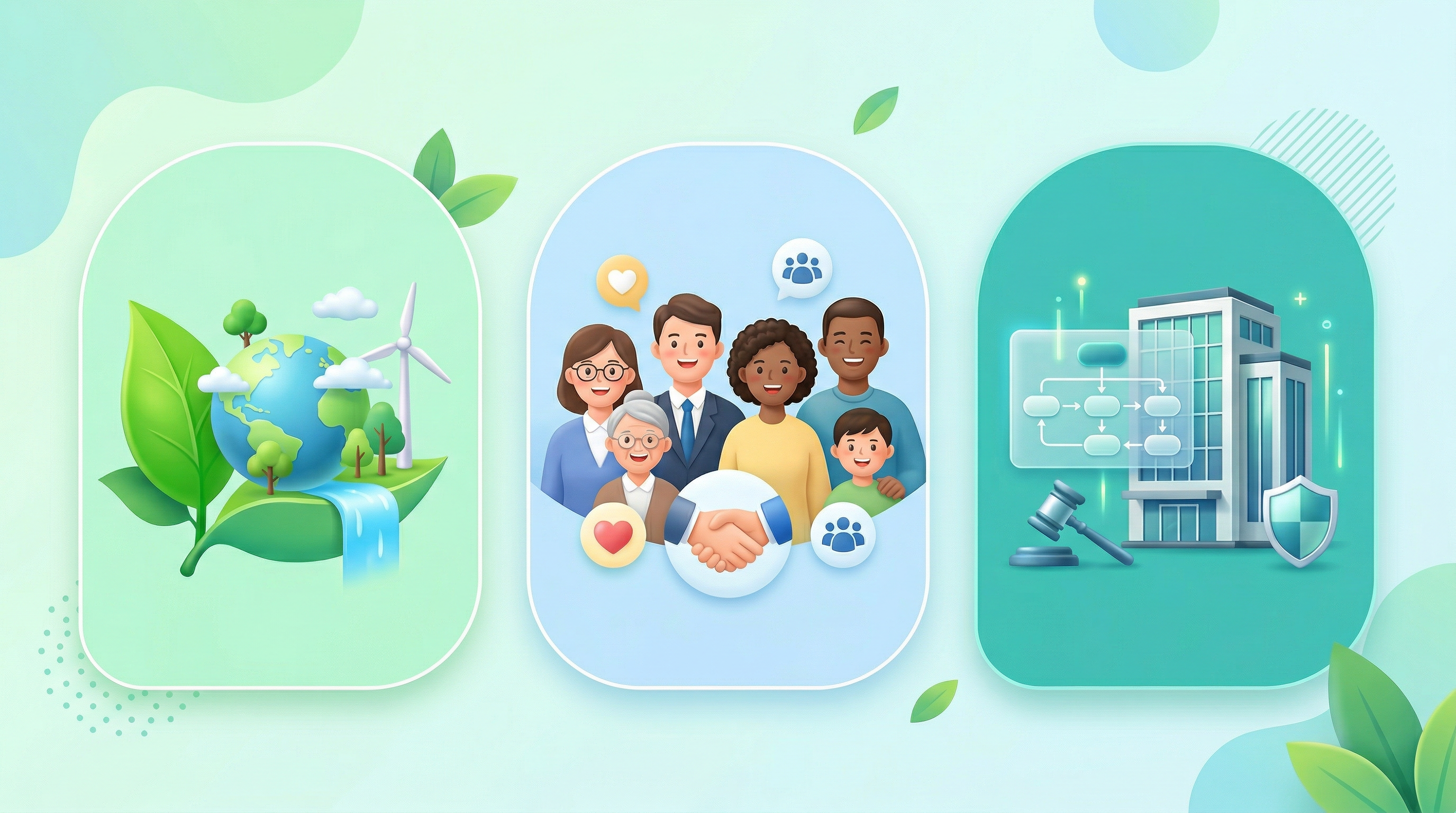 친환경은 ESG의 일부일 뿐이에요. 정확히 말하면 ESG 중 E, 환경(Environment)에 해당하는 부분이죠. 하지만 ESG에는 환경 말고도 사회(S)**와 지배구조(G)가 함께 들어갑니다.